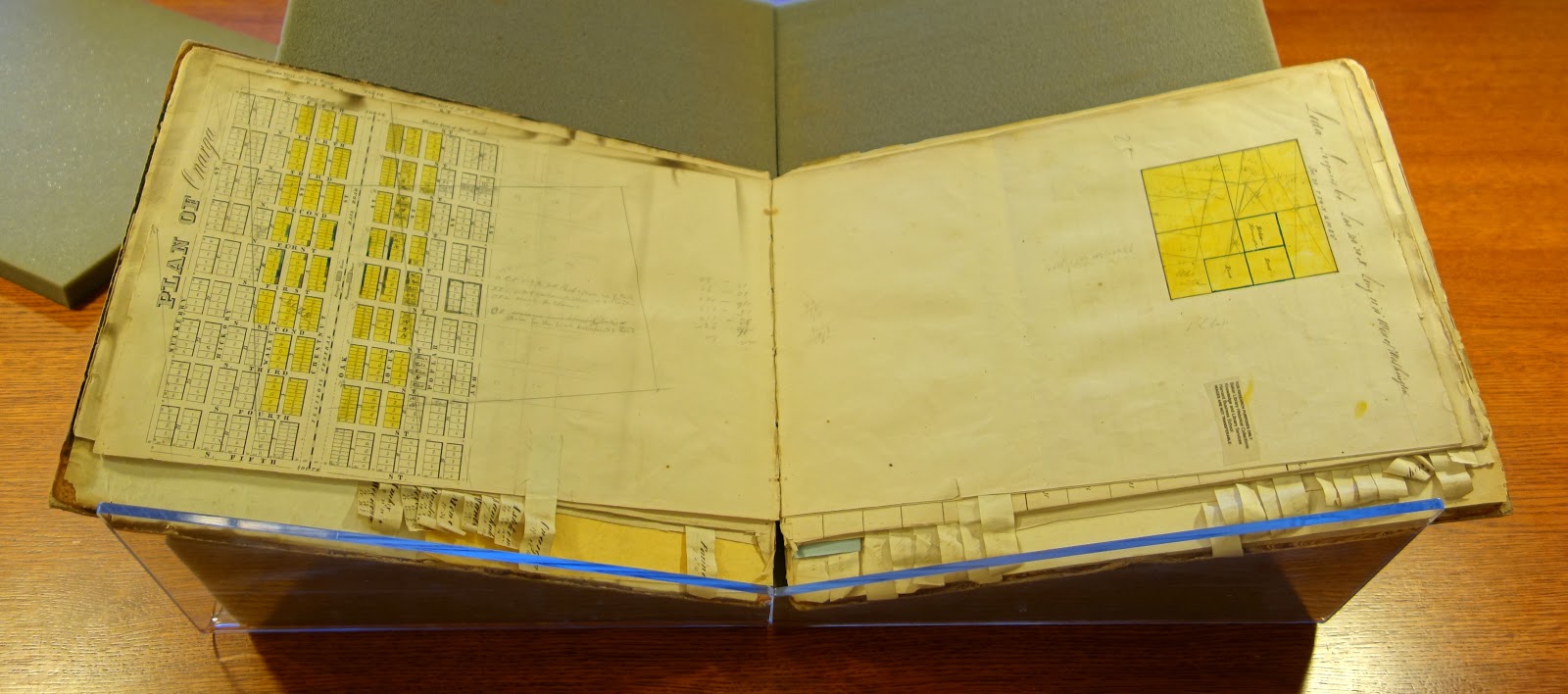 The Associates would profit from the sale of real estate, but the railroad would profit from the traffic—passenger and freight—that came to the town for the train. As noted by Richard O. Davies and Joseph A. Amato: It was not an ingrained belief in the virtues of urban design that led to a mapped prefiguration of a town, but rather an imperative to control development. Therefore, the urban template privileges efficiency and circulation over the station as a civic amenity of a lived-in environment. Naturally, varying conditions surrounding each new town required the Associates’ standard plat to be modified to suit each location. For example, the rotated grid that followed the line created flatiron parcels at the section edges. To adjust the standard template, the Associates marked each plat with pencil and yellow ink as a record of these modifications. The back of each plat contains a hand sketch of the odd-numbered section, indicating which portions were to be sold as farmland and in what proportions. See below for selected examples of the Associates’ 1850s plat book, county records of town layouts, and contemporary aerial photos of each location.