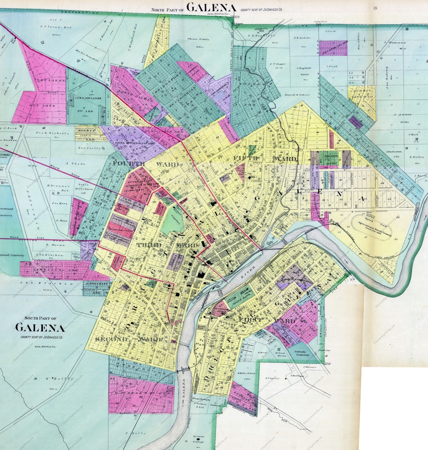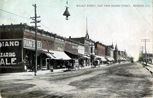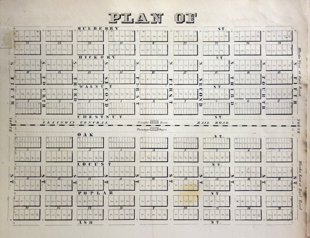 The Associates' town design is distinct in several important aspects. Although the layout of most Illinois towns adhered to the grid of the Land Ordinance of 1785 for efficiency, the Associates’ plat instead oriented the grid to the line. The railroad became the spine of the city, and all development happened outward from that geometry. On both sides of the tracks, the land was divided into a grid of 320' x 400' blocks that present their long side to the tracks, privileging circulation in the same direction as the trains. Parallel to the tracks, generous streets with a 70’ clear right-of-way are named after American tree species, such as Chestnut, Oak, Walnut, and Locust. Narrower 40’ wide alleys split the blocks. Perpendicular to the tracks, the 70’ wide streets are numbered, increasing in both directions from the center: North First Street and South First Street flank the station, creating a “ground zero” for the town. The parcels are narrower near the station, only 40’ wide, adding density and diversity along the streets fronting the tracks.