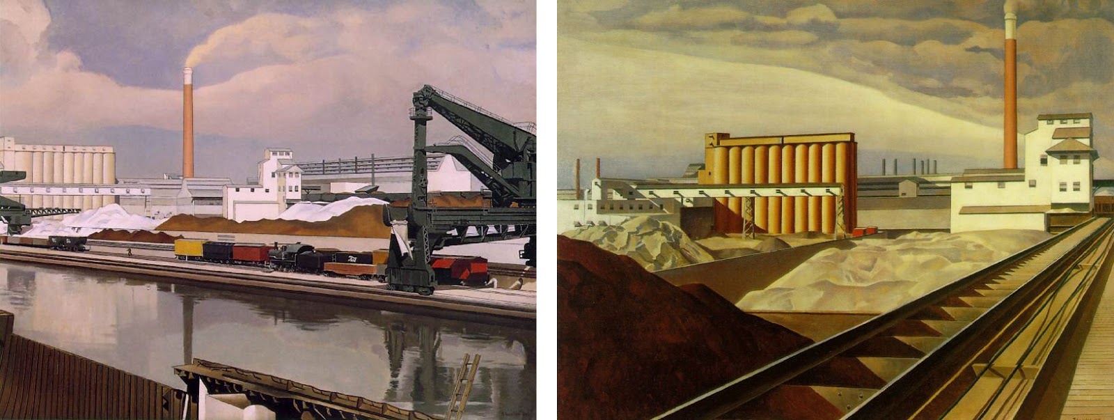 Charles Sheeler captured the innovation of industry and the railroad as they created new, uniquely American “landscapes” in the early nineteenth century. Left: “American Landscape,” 1930; Right: “Classic Landscape,” 1931.
