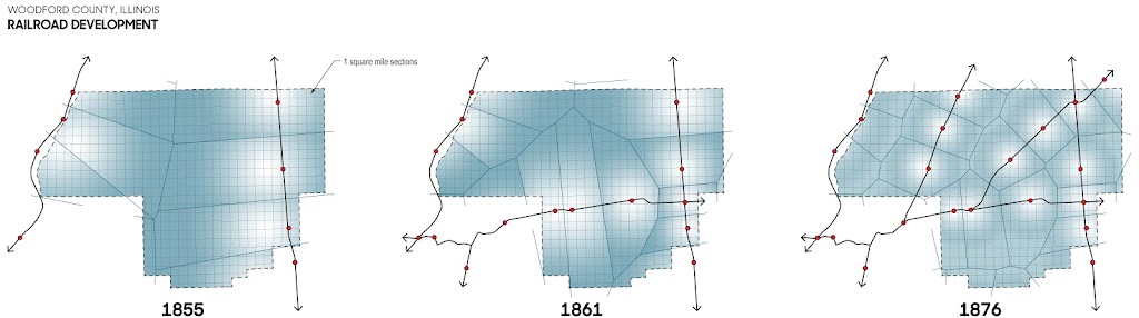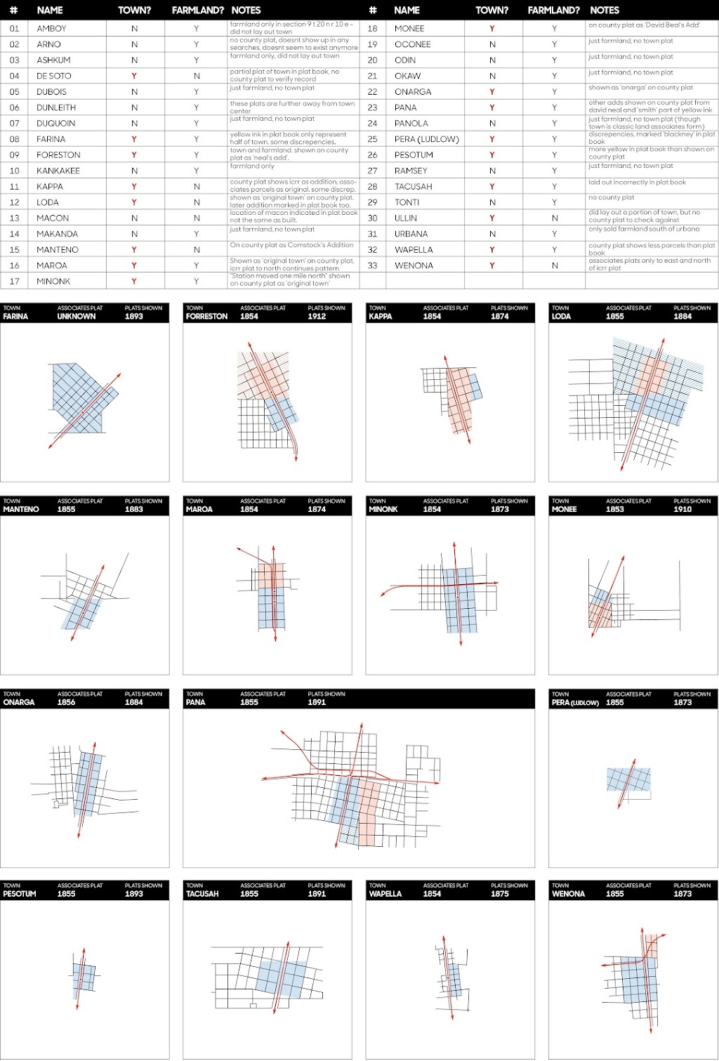 All told, the Land Associates had direct influence on the development of dozens of towns in Illinois, and indirect influence on many more. The Associates' plat book includes thirty-three entries, though only seventeen of the locations included actual town sites, some of the entries only including farmland near the listed towns. (Other historical records indicate members of the Land Associates had influence on the town layout for Dunleith, Amboy, and Bourbonnais.) Below, Associates' plats are indicated in blue while official ICRR plats are shown in orange. Notice that the ICRR adopted the Associates' urban template, and extended it where the two organizations platted abutting sections. Other landowners sometimes adopted the pattern established by the railroad companies. At other times they opted to hold the grid to the cardinal directions for efficiency within their own section.