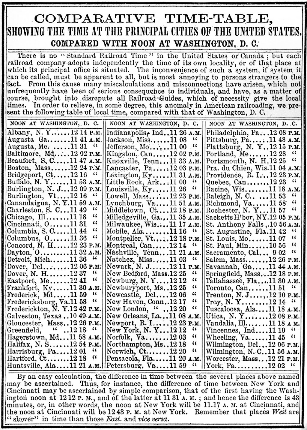 In his essay "The Economics of Time Zones," Matthew White states the problem: By one estimate, in the 1870s there were some 8,000 individual local time conventions being kept by towns and communities across the nation. Abandoning this local time system was inconceivable—as late as 1882, a U.S. Senate report on this haphazard state of affairs concluded that “it would appear to be as difficult to alter by edict the ideas and habits of the people in regard to local time as it would be to introduce among them a novel system of weights, measures, volumes and money.” Local time not only created a shared temporal sense, but also the sense of local community: one that abided by a shared and idiosyncratic time determined by a centrally located clock tower or church bell. Resistance to standardization was resistance to outside interference.