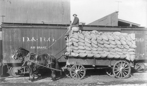 John C Hudson lays out the economies of space and scale for farmers in the mid-1800s: Wheat yields...averaged between ten and twenty bushels per acre. Taking the midpoint of that range, the output of a quarter section of land would be twenty wagonloads of grain. If the elevator were no more than eight miles away, a farmer could make one round trip in a day, including loading, hauling, waiting, unloading, and returning to his farm. Twenty days of work for marketing a quarter section of wheat at a distance of eight miles would become roughly forty days if the elevator were far enough away so that he could not complete a round trip in one day.