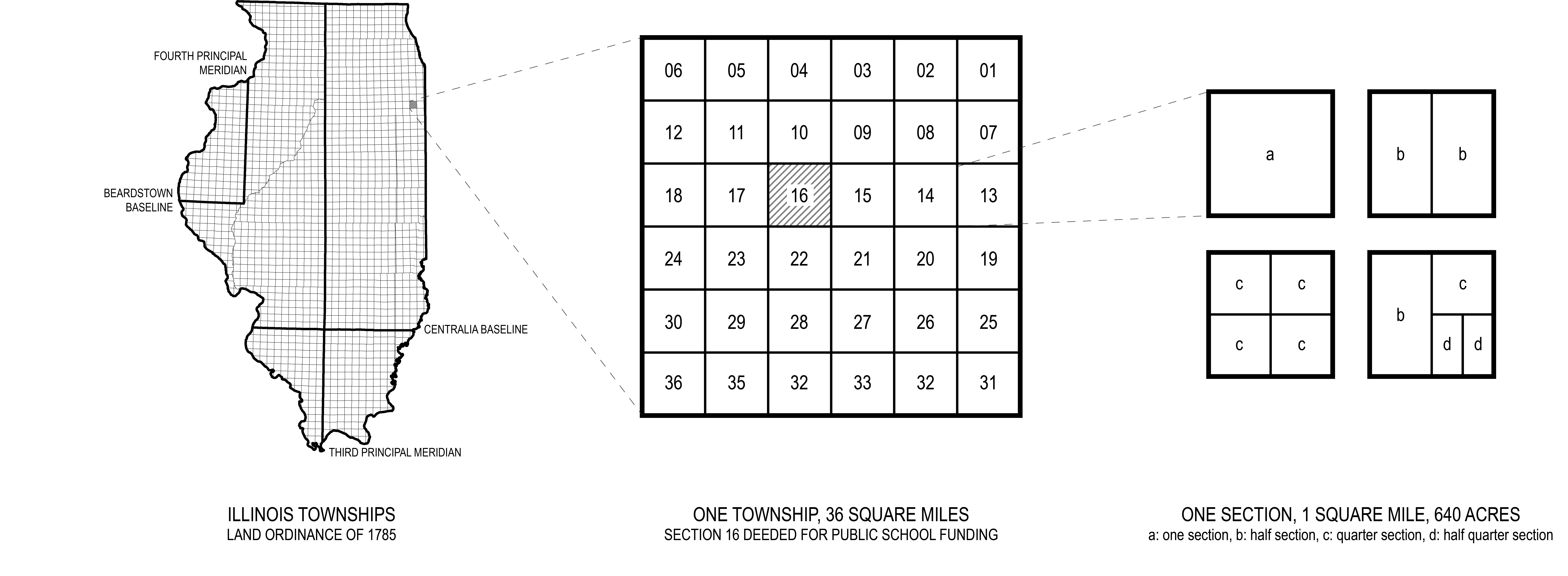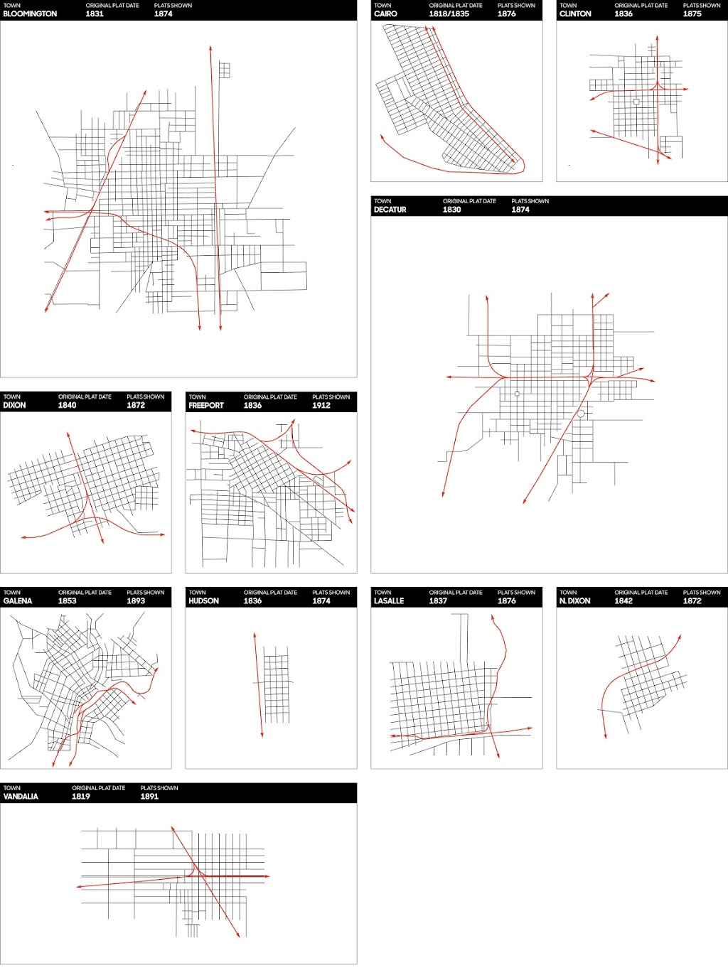 In the early 1800s Illinois’ urban form drew inspiration from many sources. A river would almost always inspire long, narrow parcels at its edge, giving each owner direct access to the waters edge for shipping. Topographical conditions would require consideration, such as a shift in the urban fabric or a road that followed the contours of the countryside. The organization of land into townships and sections distributed ownership into shapes like rectangles and squares that were aligned with the cardinal directions. As such, the most efficient layouts were grids organized along the same axes, though the size and proportion of the streets and blocks varied widely from town to town. Importantly, many were laid out around a shared, central public space: a square or plaza or park that would host gatherings, markets, and festivals. Towns were created by aggregation, platted by anyone who owned the land according to his vision of American urbanism. This tended to produce city forms that, although familiar in their overall organization, remained nuanced and idiosyncratic—a manifestation of the local imaginary.