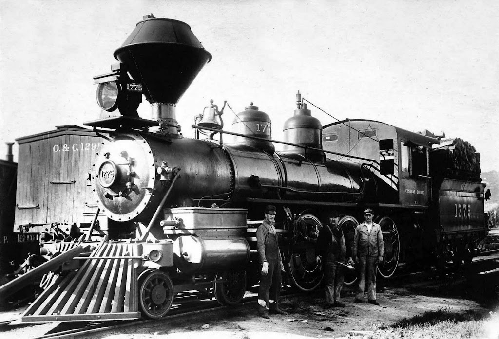 Steam engine technology had implications on spatial development patterns, but place and culture also had an effect on the design of the train itself. In the US, the most abundant form of fuel in the nineteenth century was wood. When burned for fuel in a steam engine, hot embers could escape through the exhaust and fall smoldering to the ground, thus endangering the unsettled land near the line with wildfires. American wood-burning locomotives therefore opted for a diamond shaped stack (exhaust chimney) to contain sparks and embers that could cause a fire. Coal was more common throughout Europe, so the diamond shaped stack became a uniquely American feature. Similarly, a triangular steel grating called a “pilot” (or a “cowcatcher”) was often installed on American locomotives to knock any obstacles on the tracks away from the train. [The vastness of the American West meant that deer, bison, and yes, cows, wandered onto the tracks frequently enough to demand a catcher.] In England, railroads were typically protected with fencing along the line, so pilots were not common.