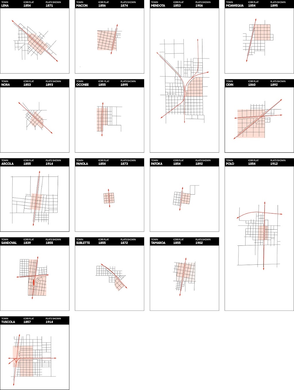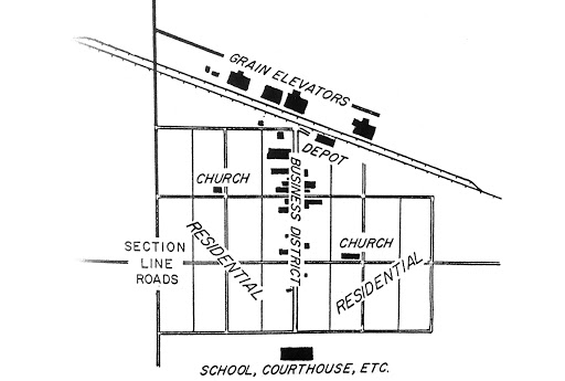 Throughout the nineteenth century towns connected to the railroad thrived while others faded and, in some cases, disappeared entirely. Collectively, these prosperous railroad towns determined a vision of American civic modernity for the age. Although the Associates only platted seventeen towns, the influence of their urban design extended far beyond the edges of those towns. The formal attributes of their template are clearly visible in other locations. This is especially true of the forty-one towns platted by the ICRR after the restriction prohibiting the railroad from developing town sites was lifted. The ICRR reproduced the Associates' unique grid rotation, block size, parcel distribution, street widths and naming convention, the disposition of the freight and passenger stations and architectural celebration of the city in the form of a depot or station, and the conspicuous absence of shared civic space in the form of parks and plazas.